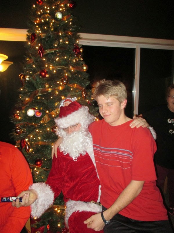 Before Santa left, Grandma hopped up on his lap, and sang "I saw Grandma kissing Santa Claus!" and gave him a big kiss. Grandpa thought it was neat to have grandkids now who could take over the tradition. It used to be him dresssing up, and then it was Daniel. Now the next generation has is covered.